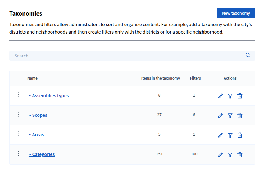 Decidim 0.30 unifies and upgrades how content is classified across the platform. Previously, scopes, areas, and categories worked in isolation—now, taxonomies bring them together into a single, customizable system. Admins can build hierarchical structures tailored to their needs (e.g., "Environment > Mobility > Cycling") and apply them across components. This makes content easier to organize, navigate, and filter—whether you're running a city-wide consultation or a small community process.